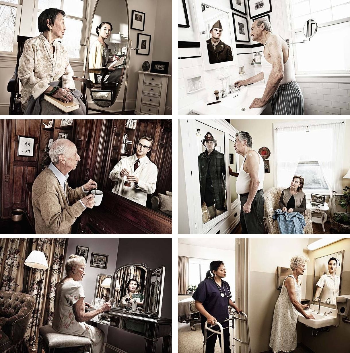 The one that strikes me the most is the carer and the former nurse, as although all the images feel positive about family looking at them and smiling, the carer is looking a bit frustrated. This unfortunately makes me feel as though it is closer to a realistic vision - of someone having a job to do.