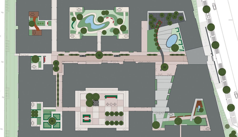 Reading more about this project, it has become really quite fascinating. The design, completed in 2009, is that all the exterior areas are surrounded by the building themselves - an obvious solution but one which has been quite sensitively done to maximise both inside and outside spaces. They also create very different areas and sense of space for different groups of people. It really is like a mini-society all within one place.