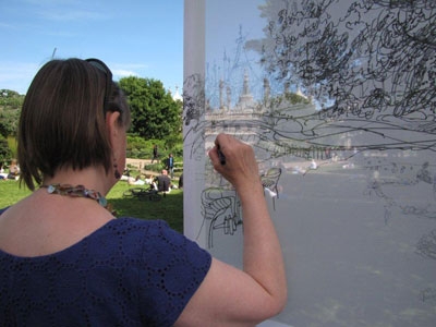 I love this idea by Sally Booth. The artist works in crowds at festivals and events - it becomes part performance, documentation and drawing.