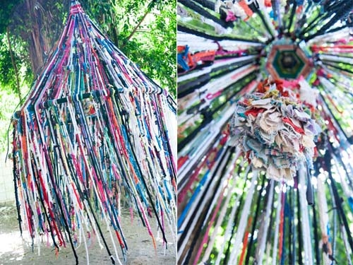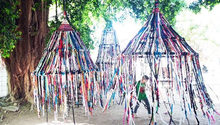 A project using finger knitting to create ropes of different colours. Communities came together to create these temporary spaces in Zichron Yaakov, Israel in 2012.
