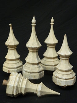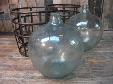 Painted wooden finials. A pair of large mouth blown glass carboys in metal strap work cages.