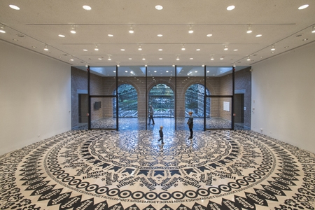 Using vinyl on the floor, Kingberg gives the viewer a mandala-like look at our consumer world. Rather than using architectural features, she uses logos and iconography of the 'Western' world to create these symmetrical patterns, cascading out into the public spaces beyond the gallery.