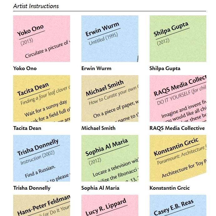 "Help make groundbreaking new art by taking part in do it – an evolving exhibition created from a series of instructions written by artists. An eclectic mix of things for you to do at the gallery and at home, the instructions range from the active to the absurd to the philosophical."