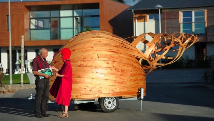 "The Conch [Sound Studio] is the latest work by artists Zoë Walker & Neil Bromwich. Commissioned by IOTA to make work in response to the Expo site, the conch is a mobile structure, part shell / part ark constructed from local larch and housed on a car trailer. The artists have used the conch to conduct interviews with people living in a diverse range of communities around Inverness including Cromarty, Merkinch and Findhorn. The resulting soundtrack - experienced inside the Conch - draws on the interactions the artists had with the Highland public over the last few months. This part of the project has continued to develop and grow as the artists have met and interviewed a wide range of visitors at Scotland’s Housing Expo site."